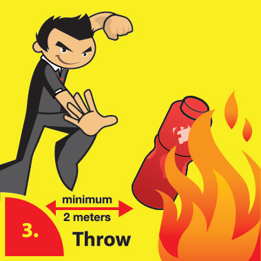 No, do not throw FLAMOFF Throw & Extinguish directly into a burning wok or pan as it will cause the hot oil to splatter and spread the fire to the adjacent area. Instead, you should wet a cotton fabric or kitchen tower with FLAMOFF Throw & Extinguish solution, and cover the burning wok or pan slowly to extinguish the fire.