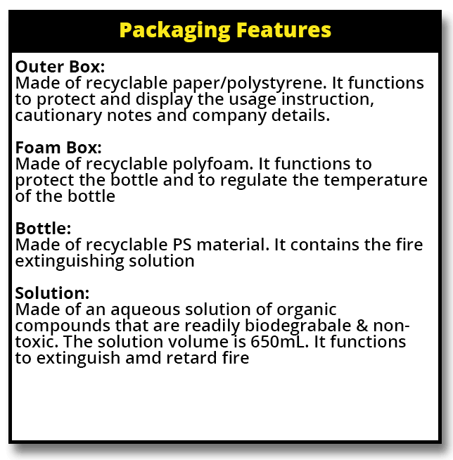 Traditional chemical powder-based fire extinguisher comes in a pressurised tank or canister and is normally heavy and bulky. The mechanism is hard to operate, especially for woman, children and senior citizens. Only able-bodied adults are able to lift and use it. Furthermore, it has to be operated at a close range with upwind position to put out a downwind fire. It does not have any cooling effect and the powder emission will create a hazy atmosphere which will blur out vision for at least 30 seconds. Inhalation will cause coughing and severe choking. It also requires annual inspection by the authorities.
