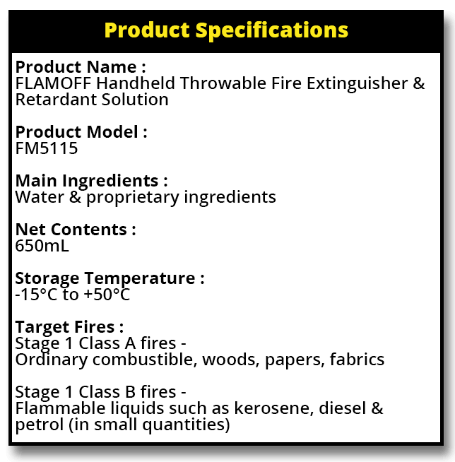 The FLAMOFF Throw & Extinguish is sealed in a bottle container with polyfoam and it is non-combustible. Store FLAMOFF Throw & Extinguish at room temperature and avoid prolonged exposure to direct sunlight. The liquid content is 80% water and is non-flammable.